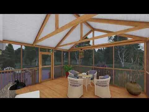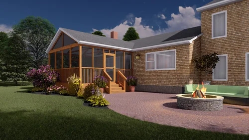 The client had an existing deck with stairs, and wanted the addition of a screened porch. The new porch was modeled and rendered to show the new roof with exposed beams, brick patio and updated landscaping.