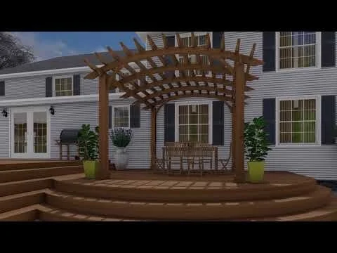 This large two-level deck and patio was designed to showcase the natural surroundings of the location. Featuring a curved pergola and construction in red oak, the deck is perfect for large gatherings.